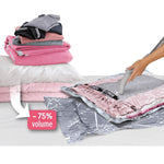 Set of 2 Large vacuum-packed space-saving cases with dimensions of 55 x 80 x 0.2 cm. Equipped with the exclusive Q2 Valve that ensures maximum speed and convenience since it works with any vacuum cleaner. The bag has a nice decorated side and a transparent back to recognize the contents. It is made with a multilayer material that guarantees strength, maximum seal and durability. The hinge is double welded for a safe and multiple use.