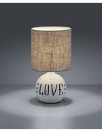 La lampada da tavolo ESNA di Trio Lighting presenta una base rotonda in ceramica finitura sabbia decorata con la scritta "LOVE" e paralume in tessuto color cappuccino, interruttore a filo incluso.