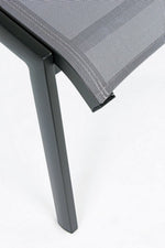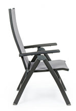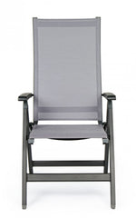 aluminum frame, powder coated (polyester). seat and back upholstered in phifer 1x1 textilene. reclining backrest (5 positions). folding