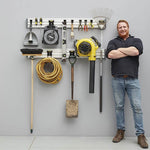Tool organizer designed to neatly store all your tools, power tools, gardening accessories and everything in your garage. Fully customizable and integrable system as it is possible to add many accessories and other rails.