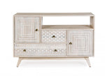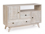 structure in mango wood, back and drawer bottom in mdf. nitrocellulose-based paint with light white pickling. decoration with hand made inlays. brass knobs. feet to be assembled.