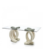 MATERIALS: Top: Polished edge tempered glass Legs / Base: White agate fossil stone and Gray Stone Structure Legs: Marine plywood COLOURS: Glass: transparent legs / base: beige and gray