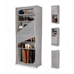 Useful and comfortable shoe cabinet in gray fabric with seven shelves. Frame and shelves in metal and resistant plastic. Double opening with hinges.