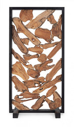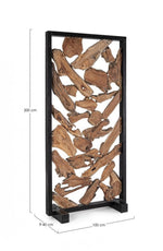 Meranti Wood Structure, Internal Panel In Teak Roots With Water Based Finish. The shapes created by the wood are only indicative, all products will be different from each other. Feet To Assemble. Measurements = 100a - 9/40b - 200h