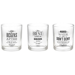 - This set of 3 glasses with assorted writings is ideal for serving water or carbonated and soft drinks, and can be combined with the other cocktail glasses, as well as with the other accessories that complete the line: hors d'oeuvre trays, mini pallet trays and textile accessories for a en place really cool!