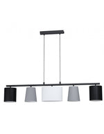 The suspension lamp of the EGLO brand, ALMEIDA model, has a design with a black metal rocker and 5 fabric diffusers of various shapes and sizes, available in white, black and anthracite.